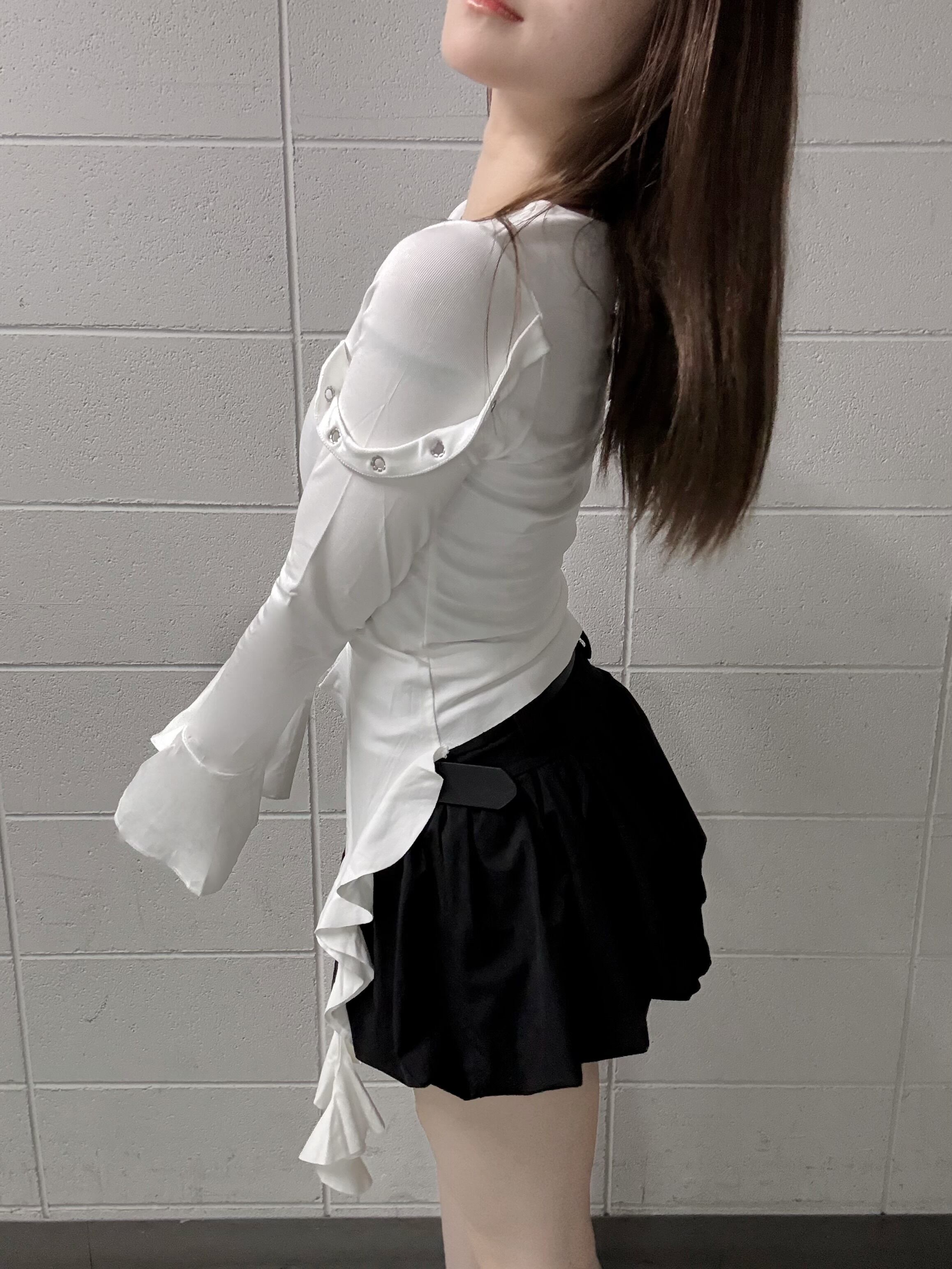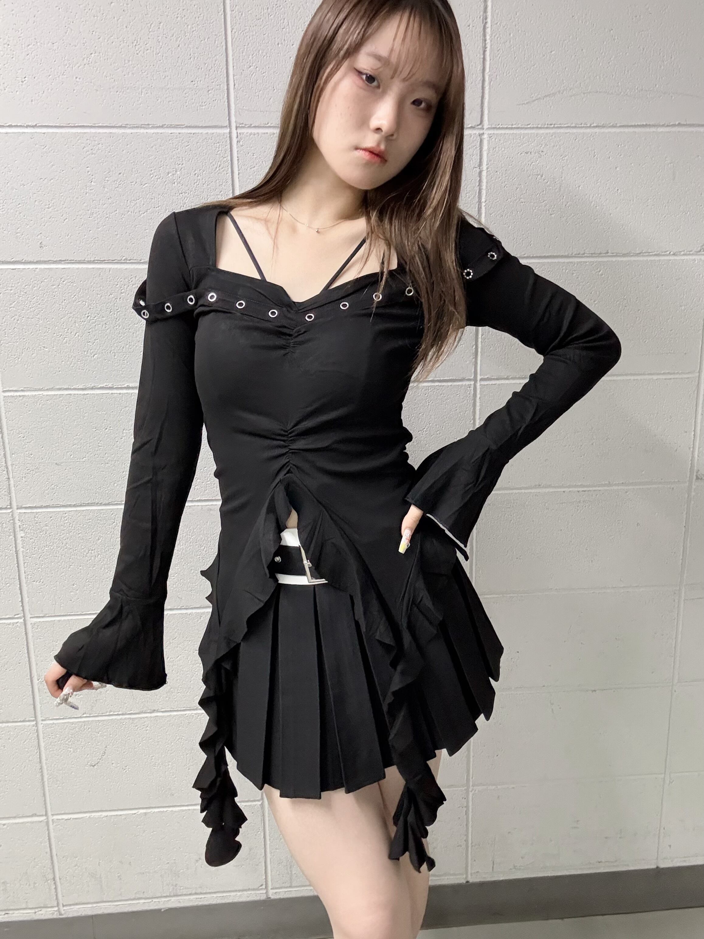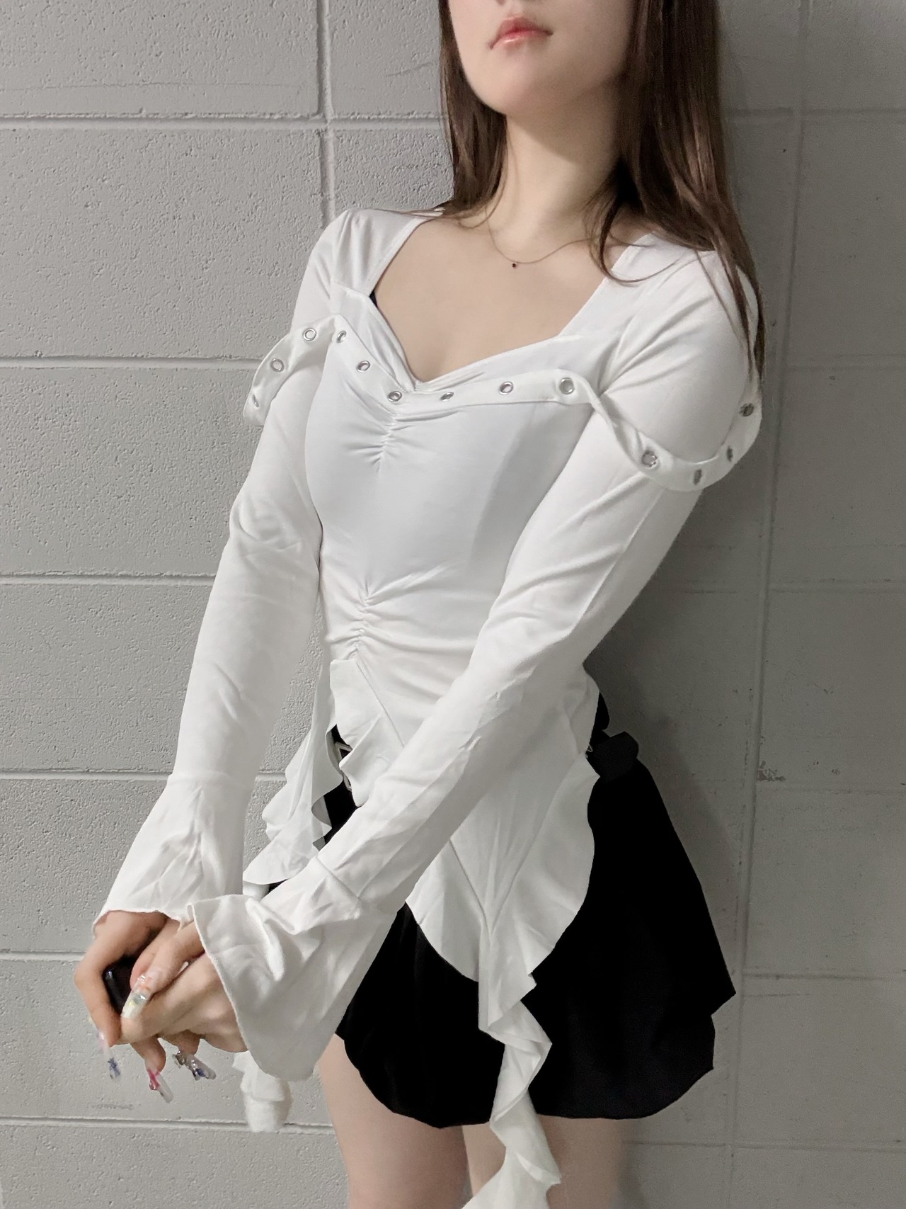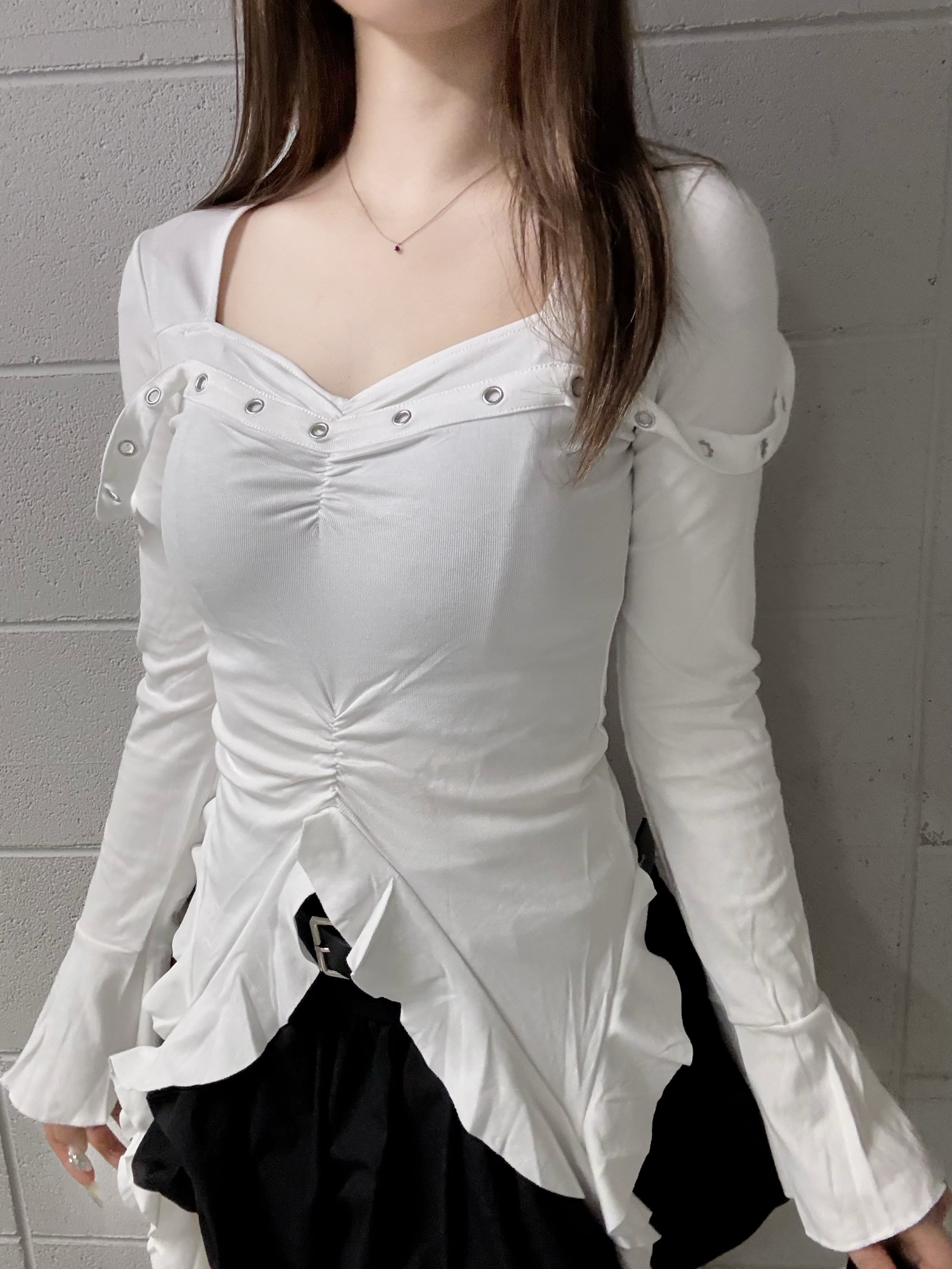裾の垂れ下がったフリルがトレンドライクなトップスです。
