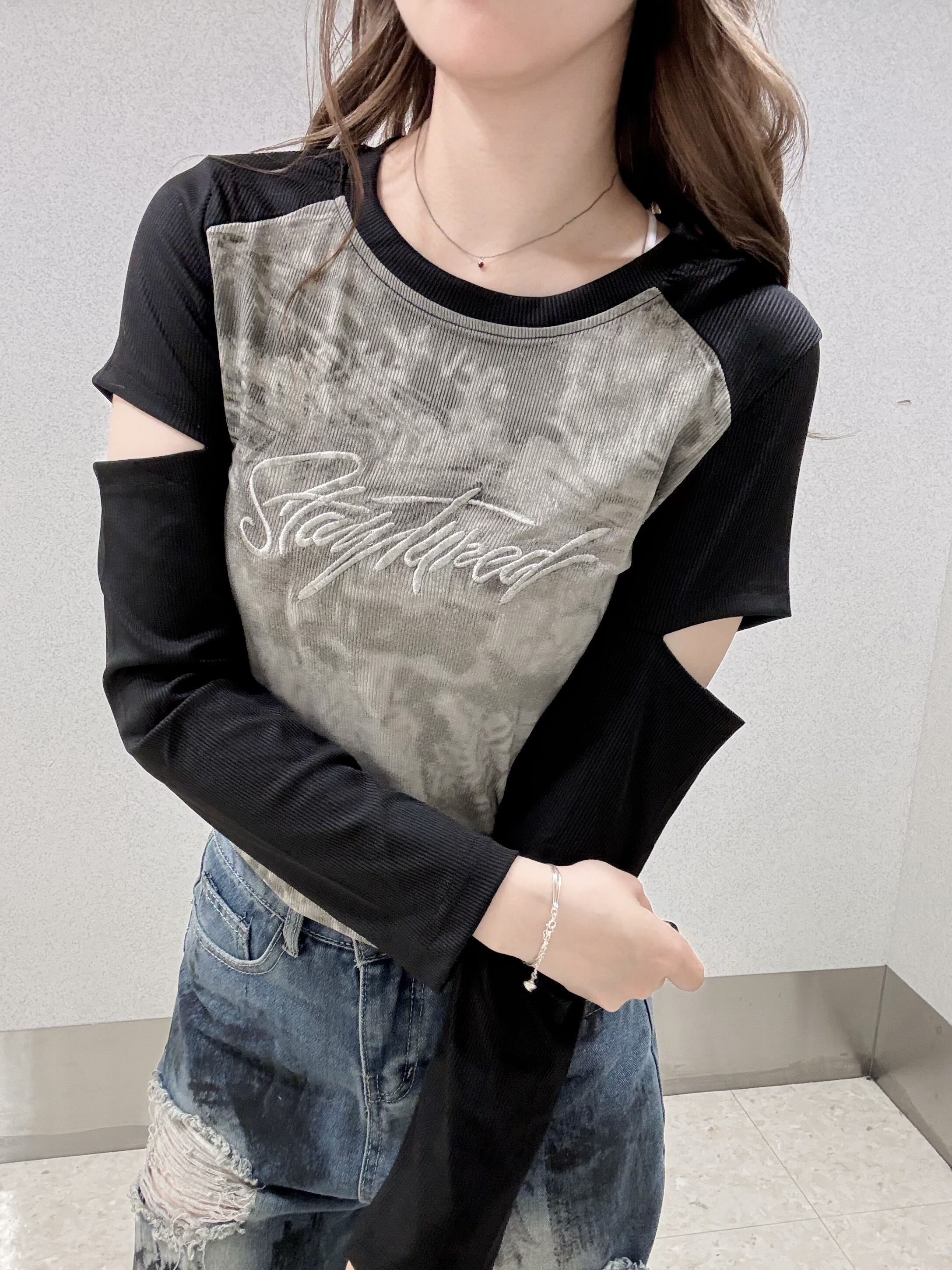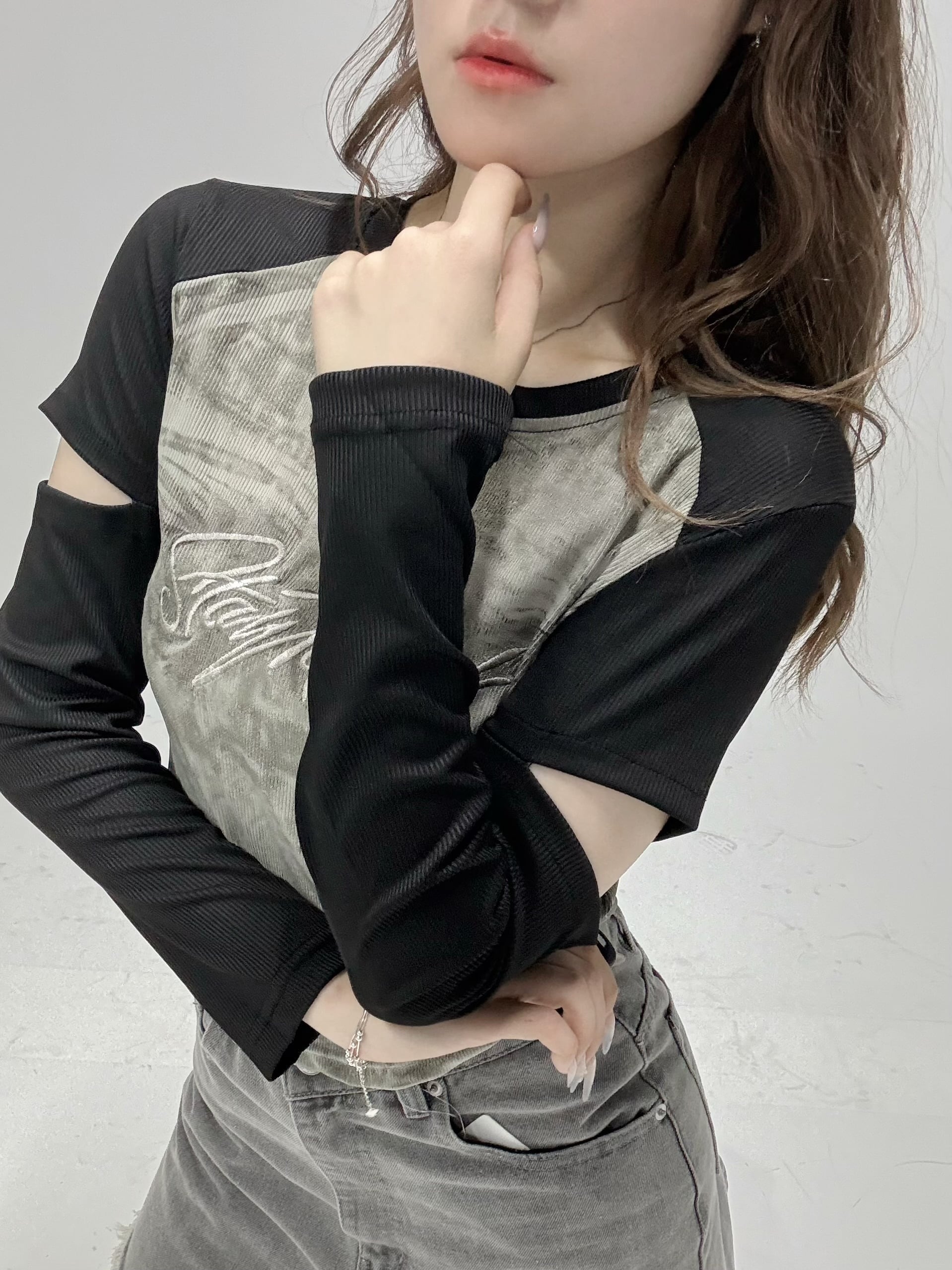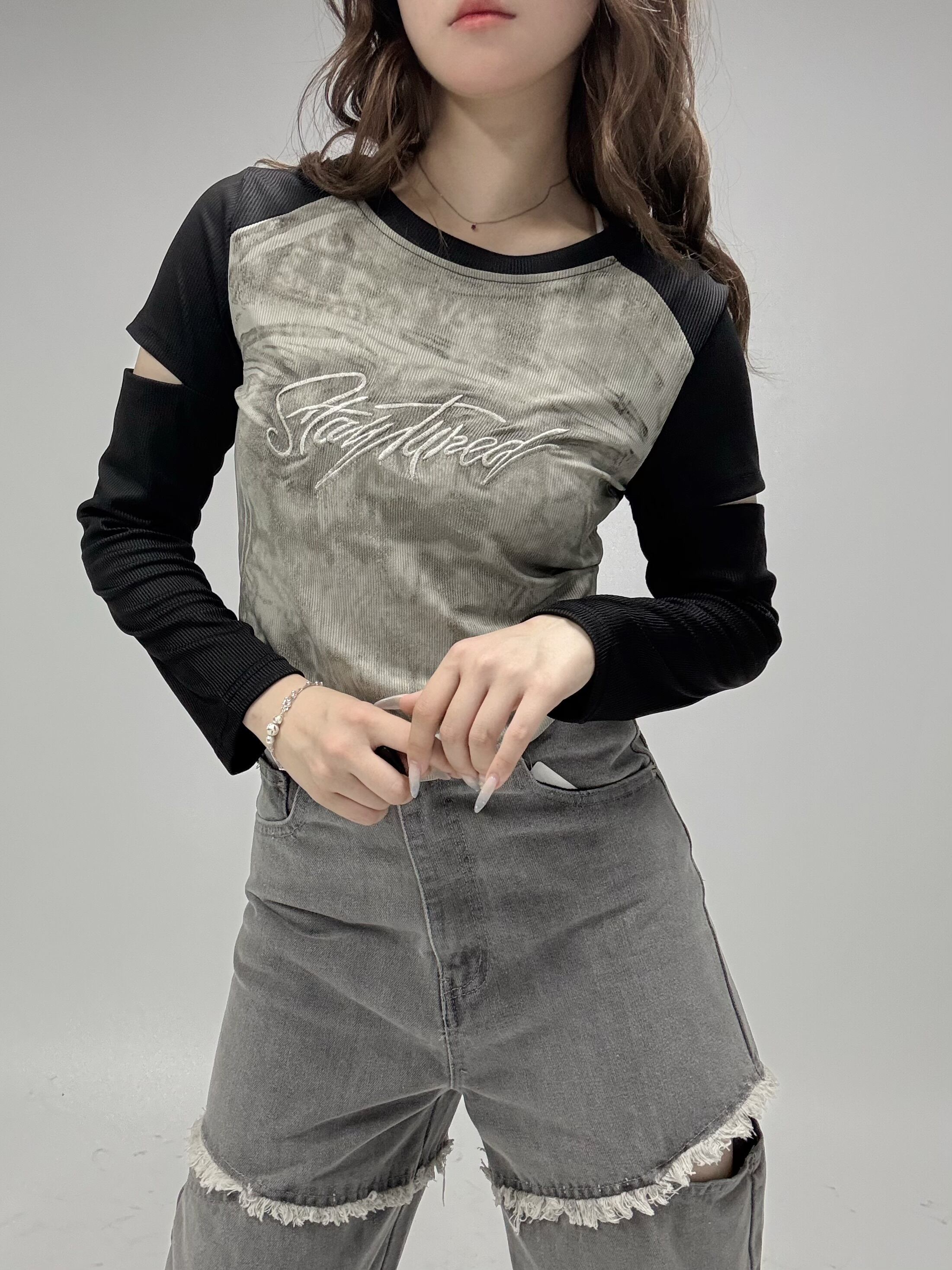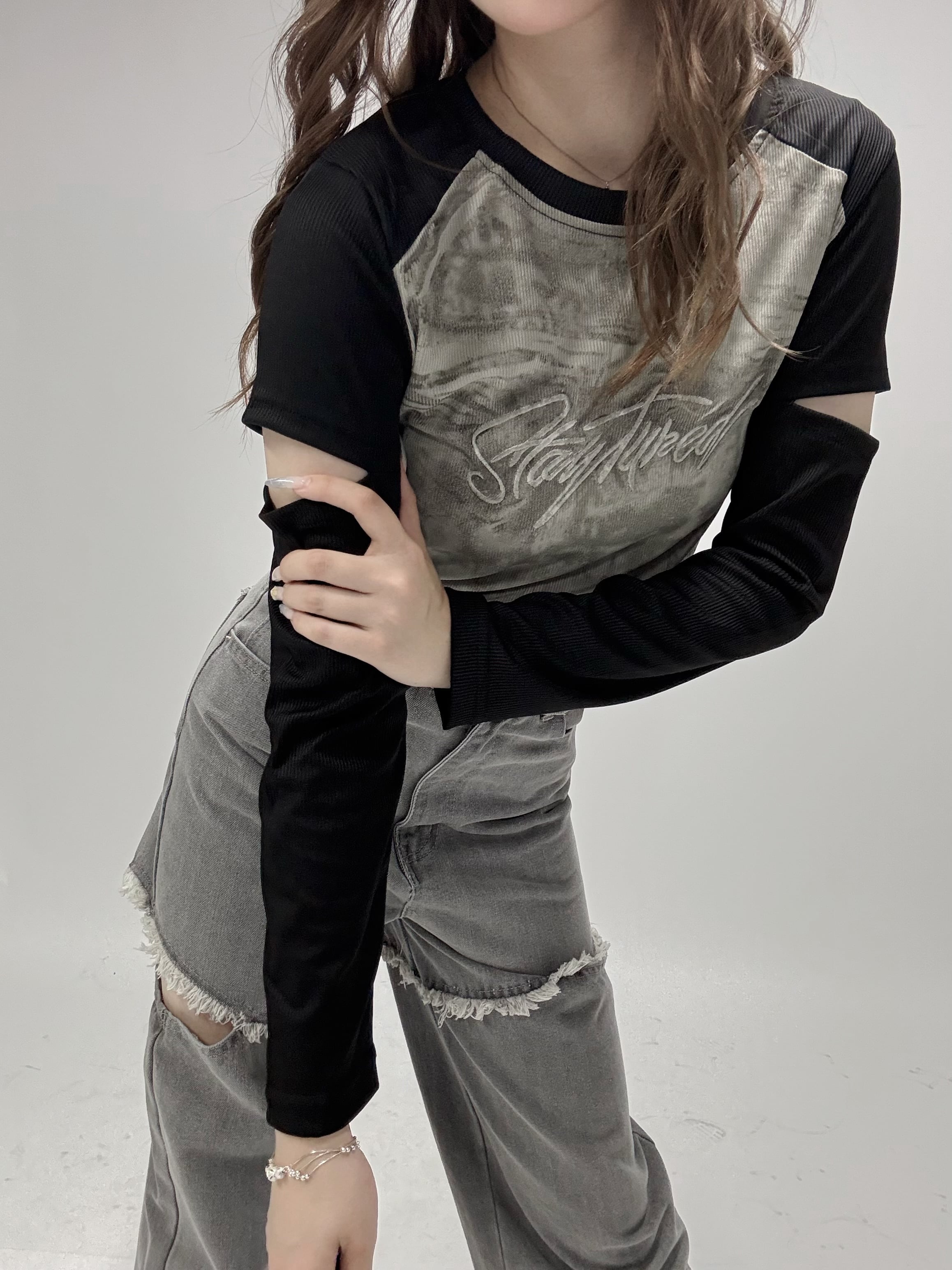 袖カットアウトと刺繍のデザインのラグランロンT。