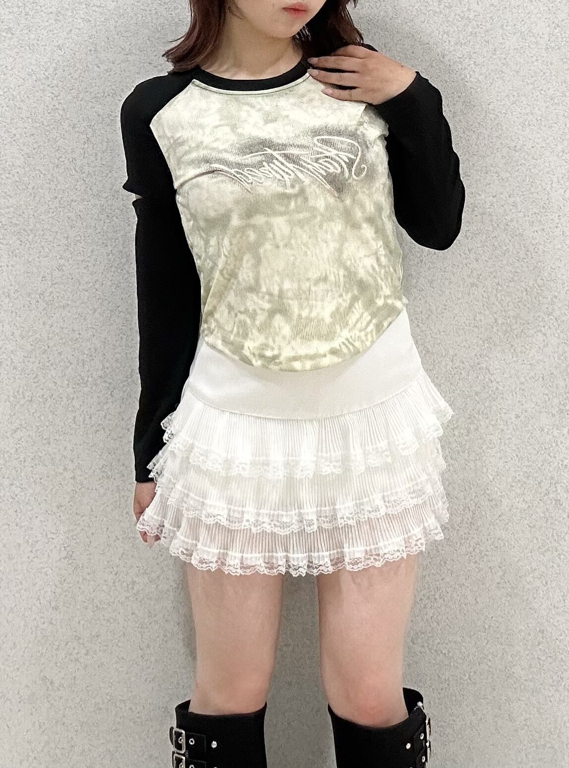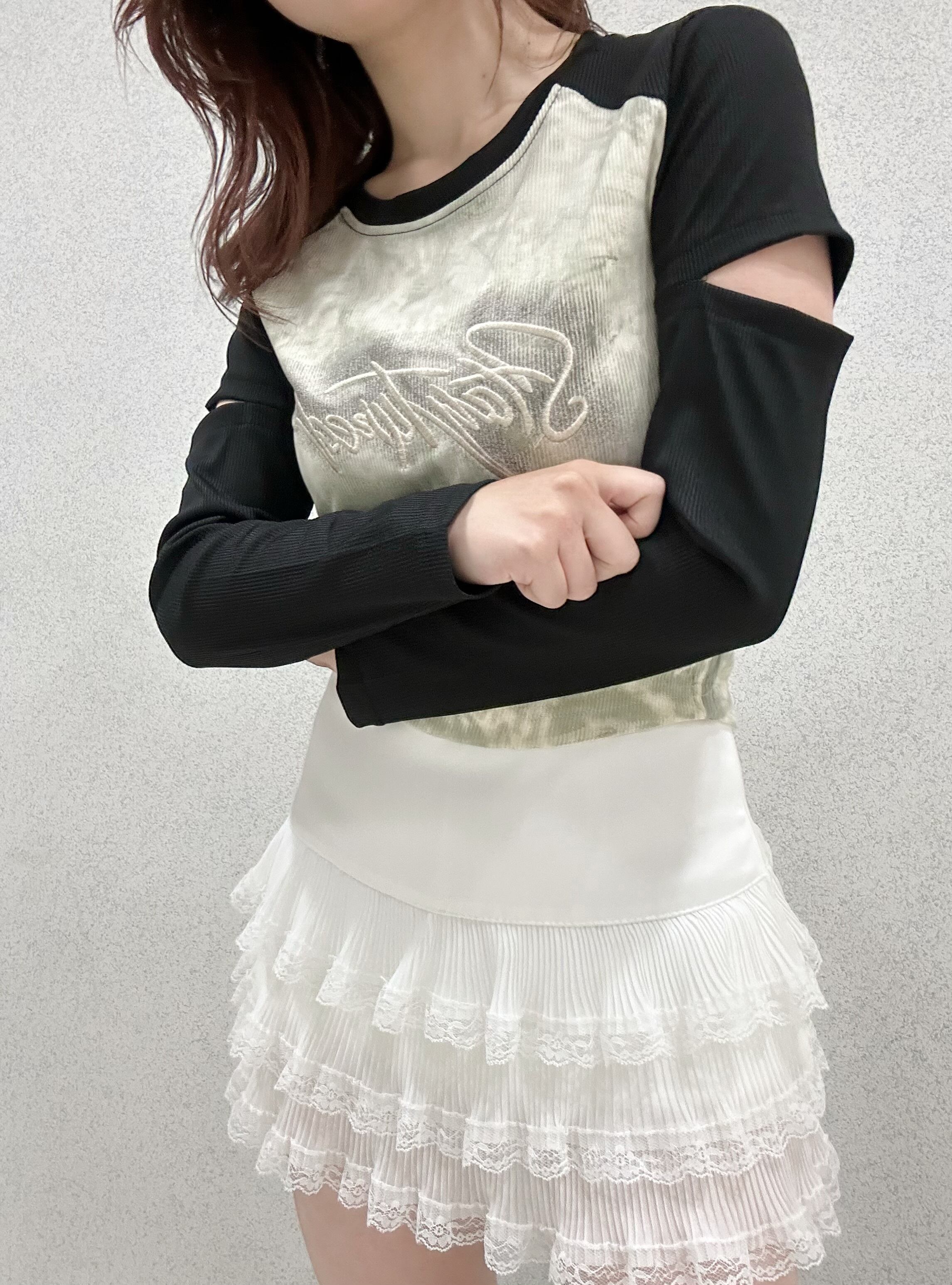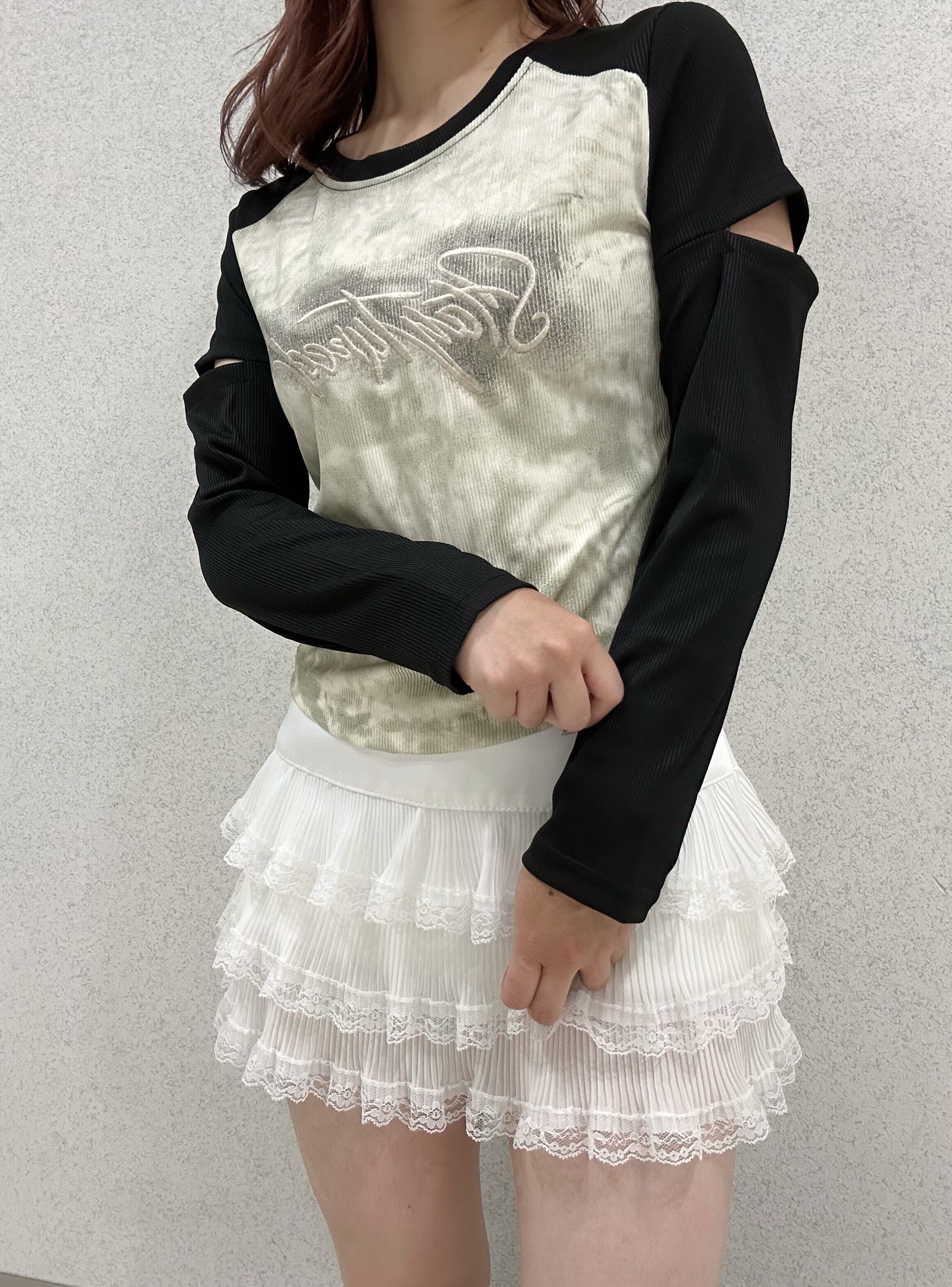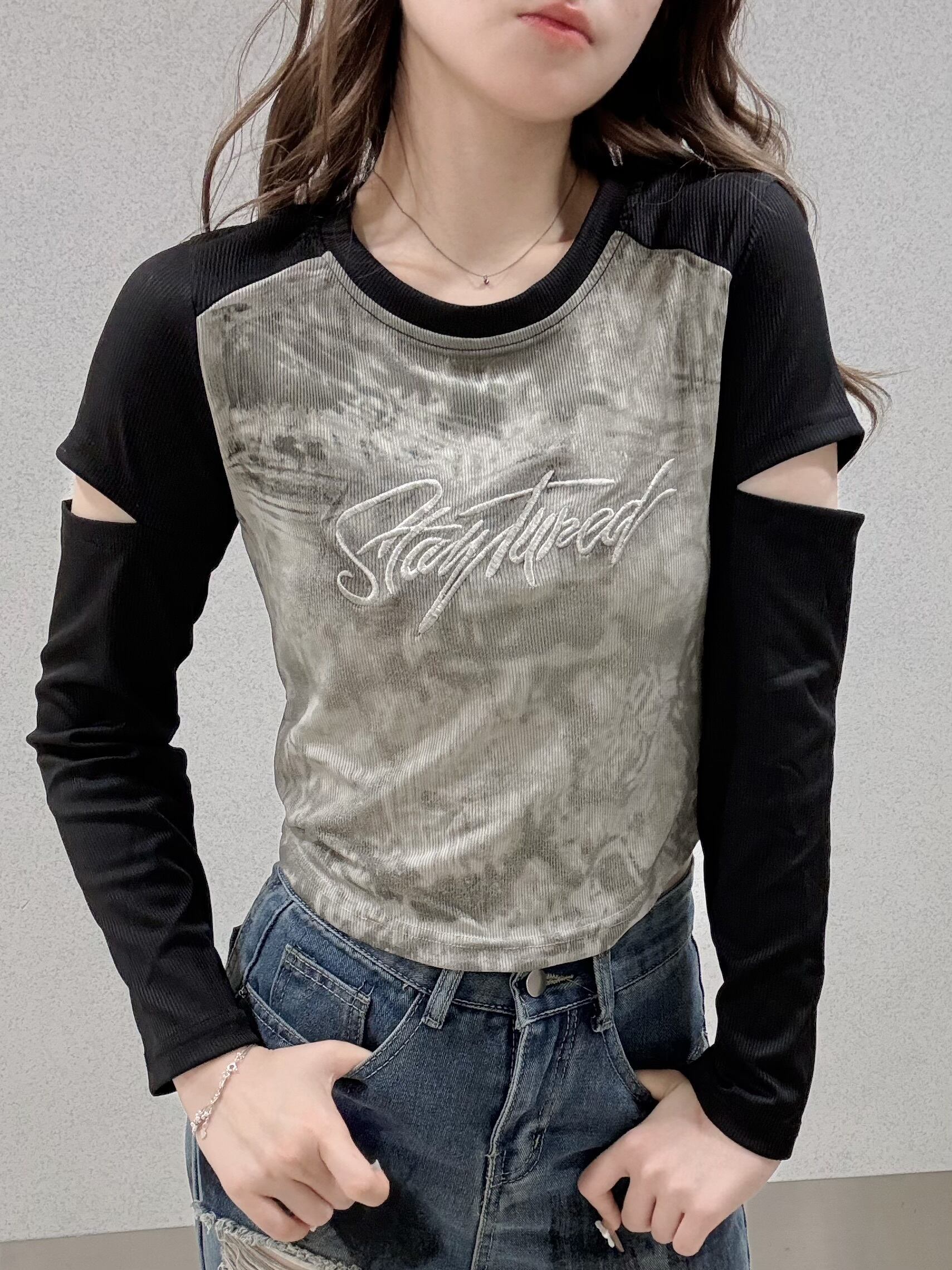 袖カットアウトと刺繍のデザインのラグランロンT。