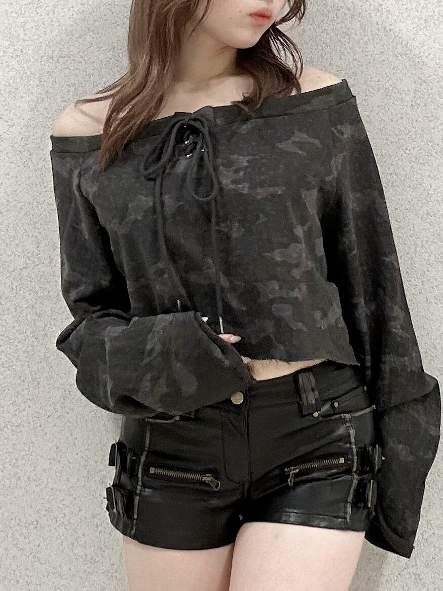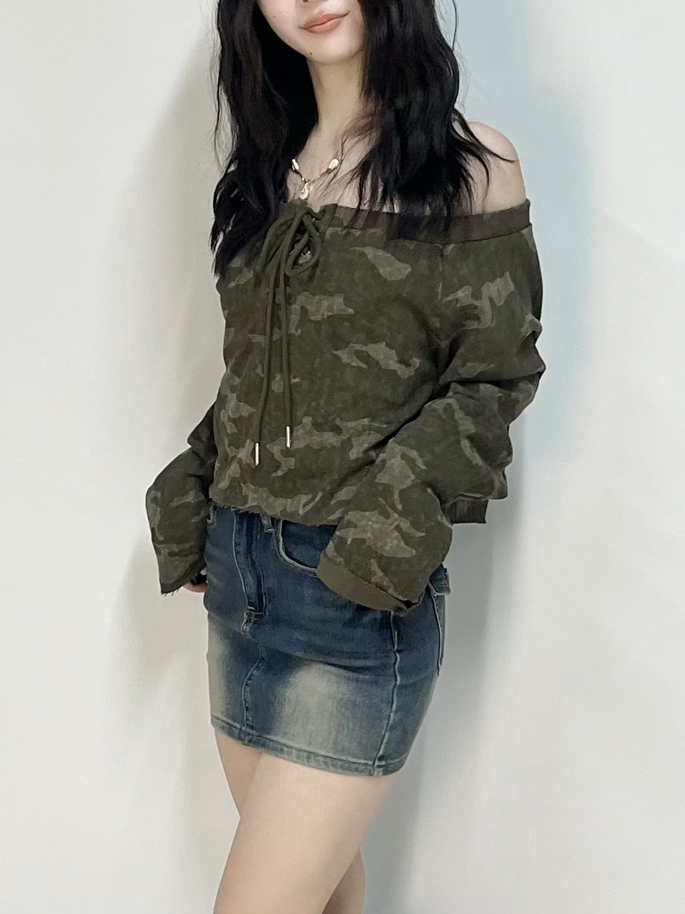 エッジの効いたスタイルを楽しむcamouflage off shoulder PO。オフショルダーのデザインに、迷彩柄をチョイスしたトレーナーは、カジュアルでありながらも個性的な印象を与えてくれる一着です。肌触りの良い素材を使用し、着心地も抜群なので、デイリーコーデから特別なシーンまで幅広くご活用いただけます。シンプルなボトムスとの組み合わせで、気軽にオシャレを楽しめるアイテムです。