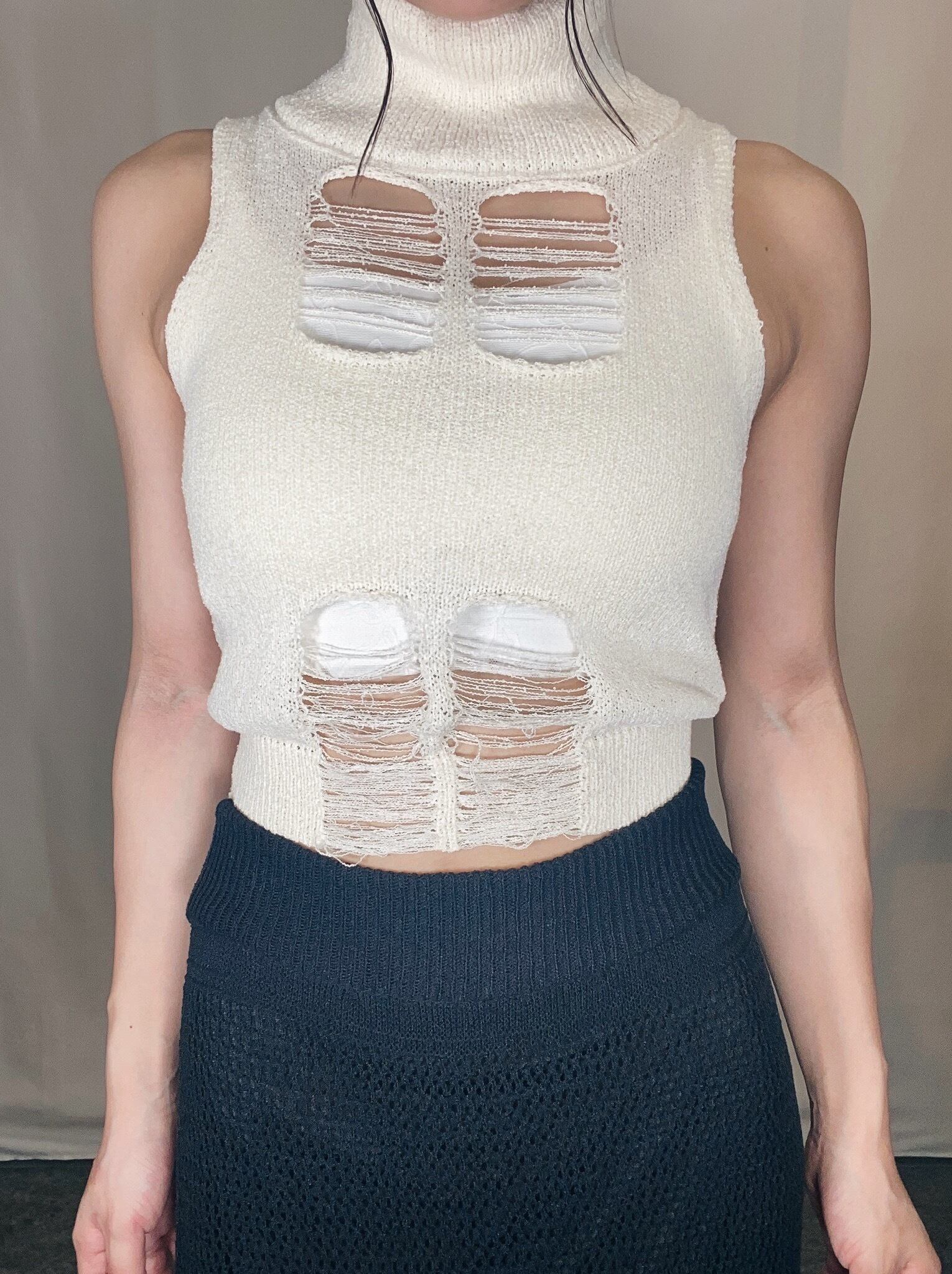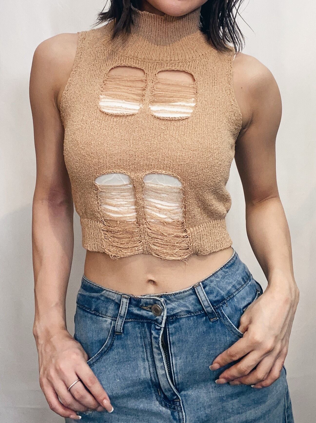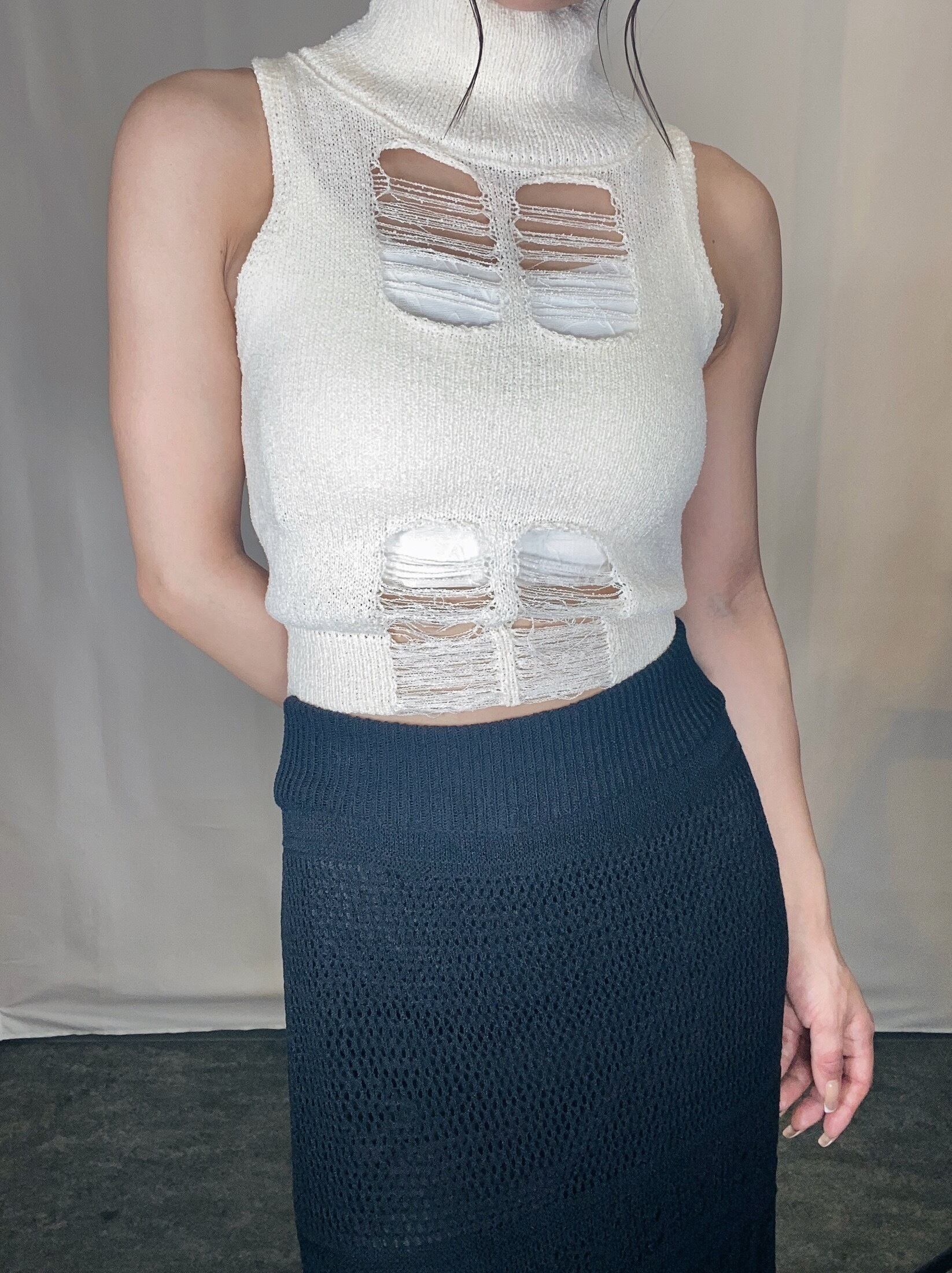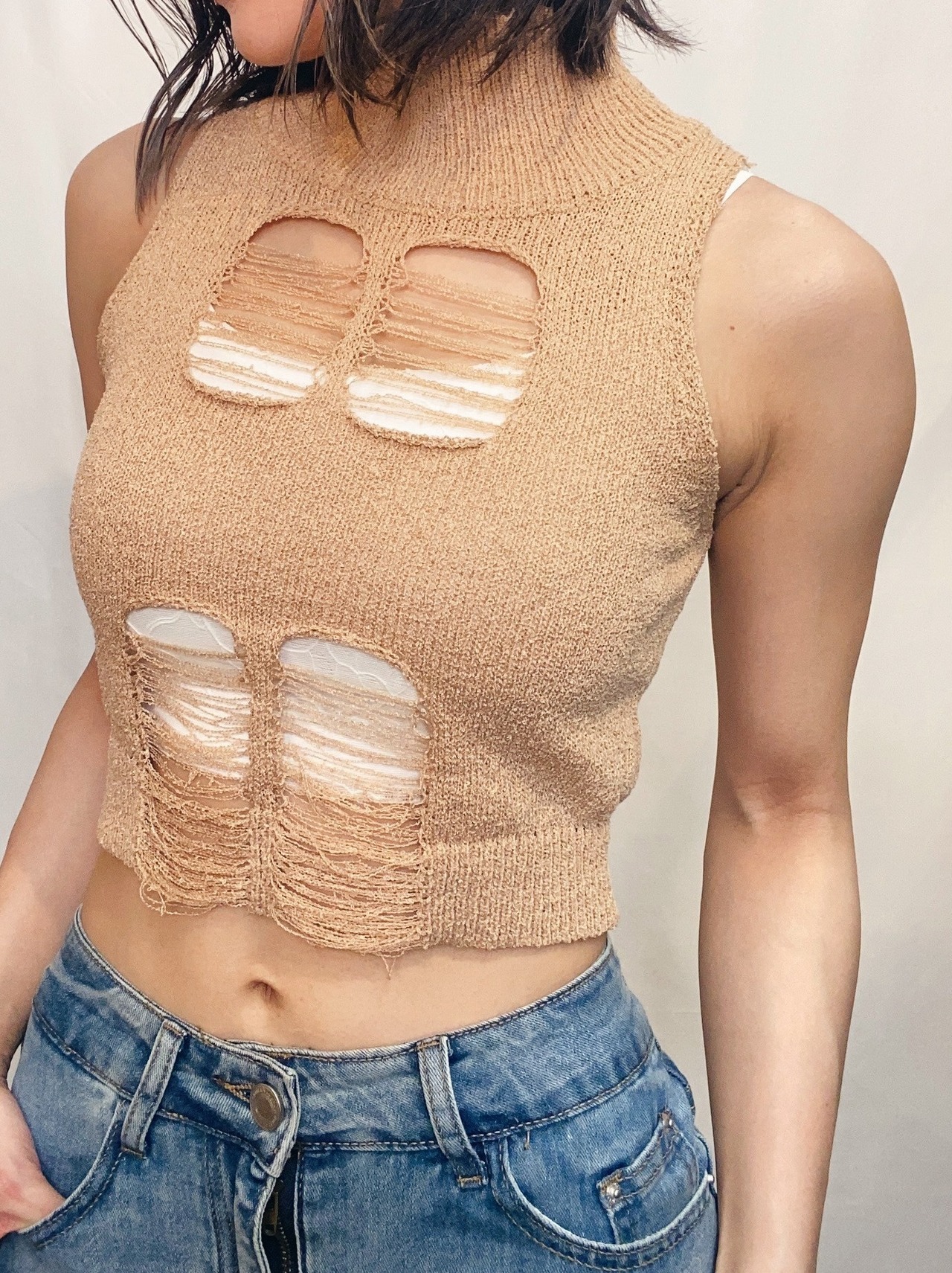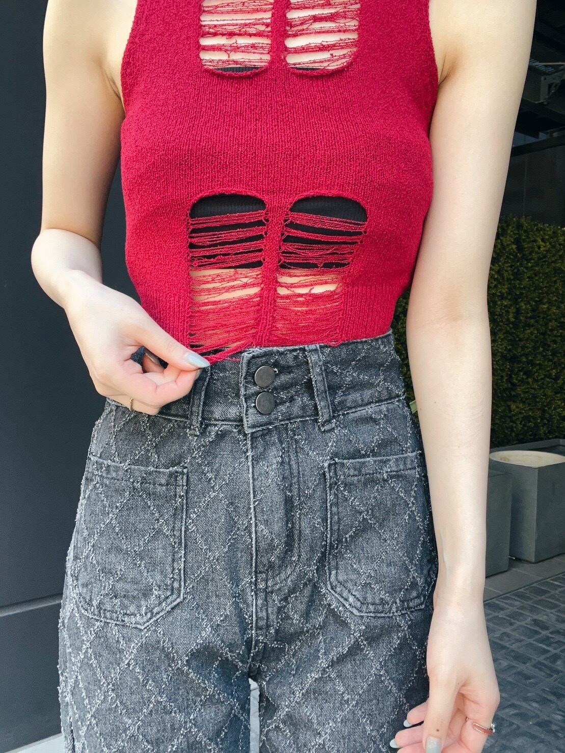 フロントにダメージ加工が大胆に入ったニットトップスです。インナーにはチューブトップやレースキャミなどで着回しもしやすい◎