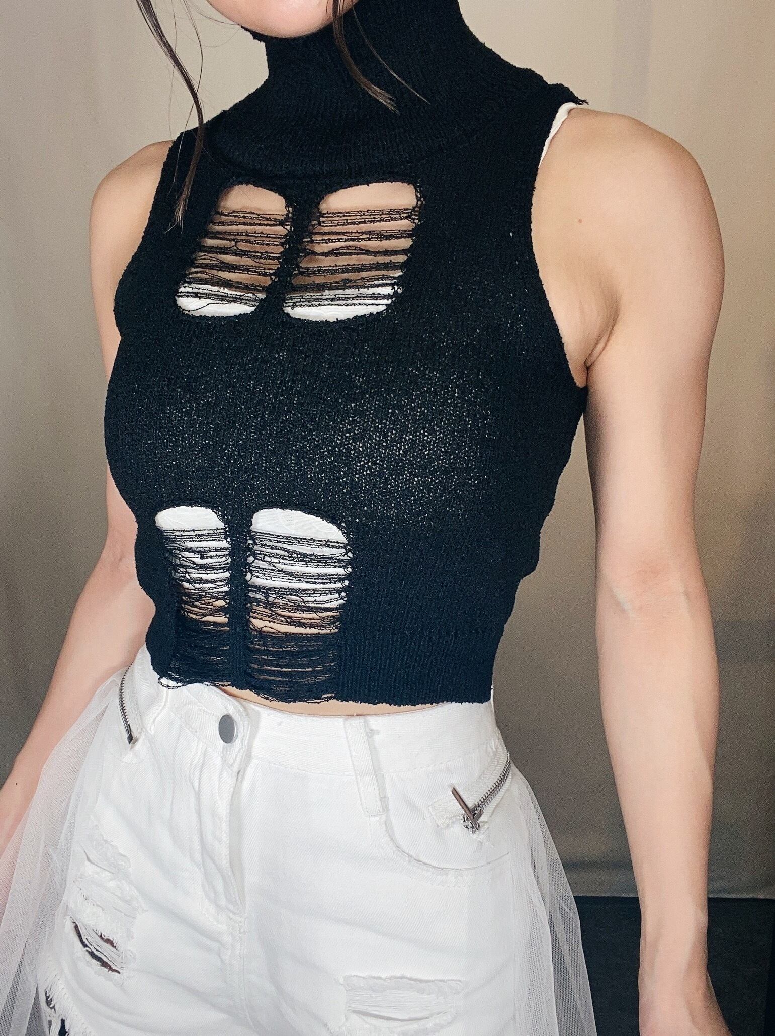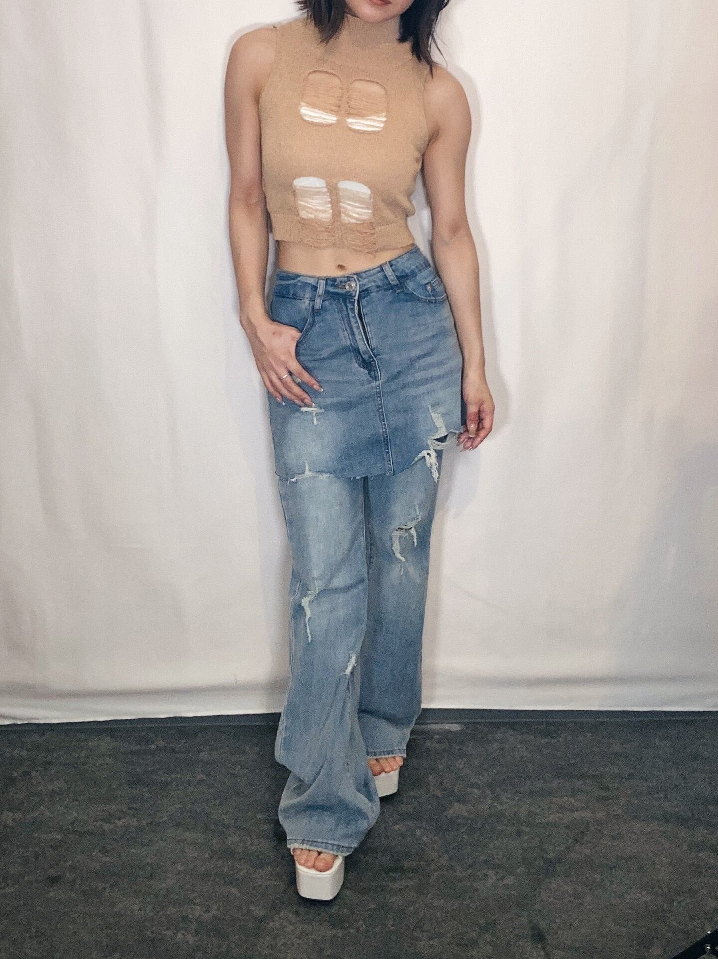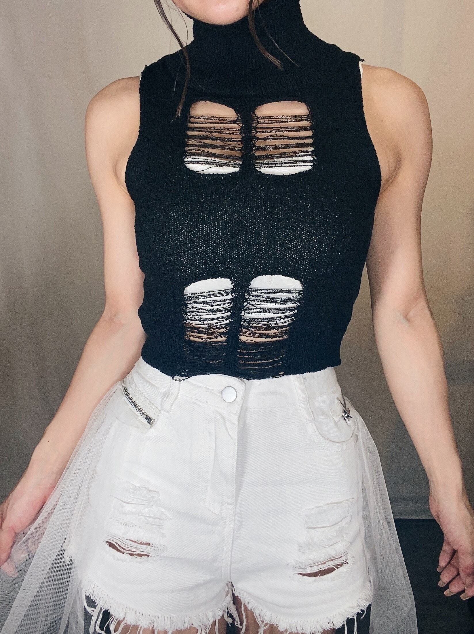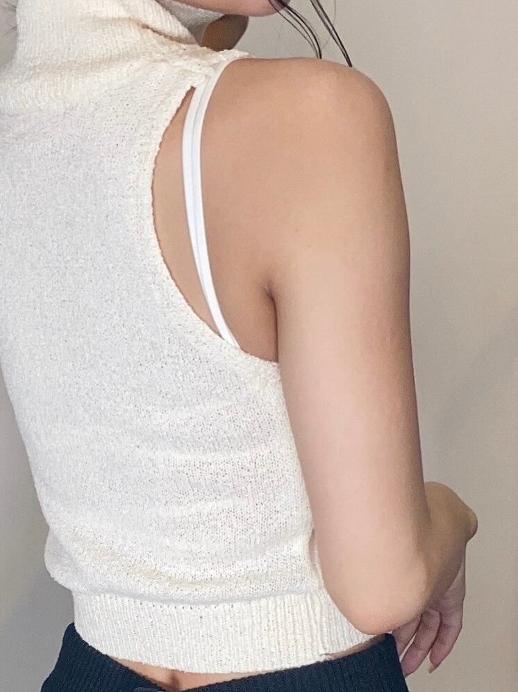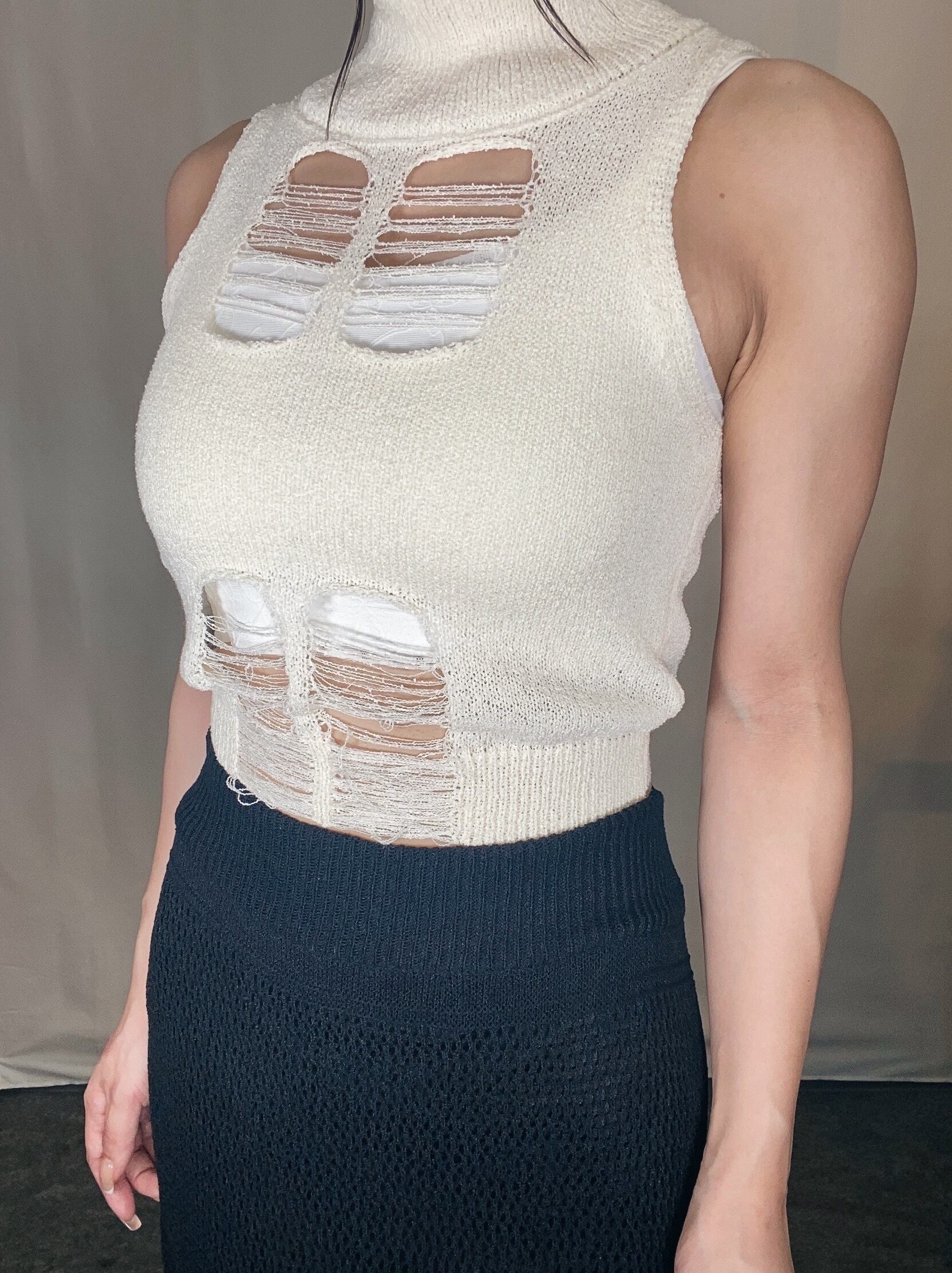 フロントにダメージ加工が大胆に入ったニットトップスです。インナーにはチューブトップやレースキャミなどで着回しもしやすい◎